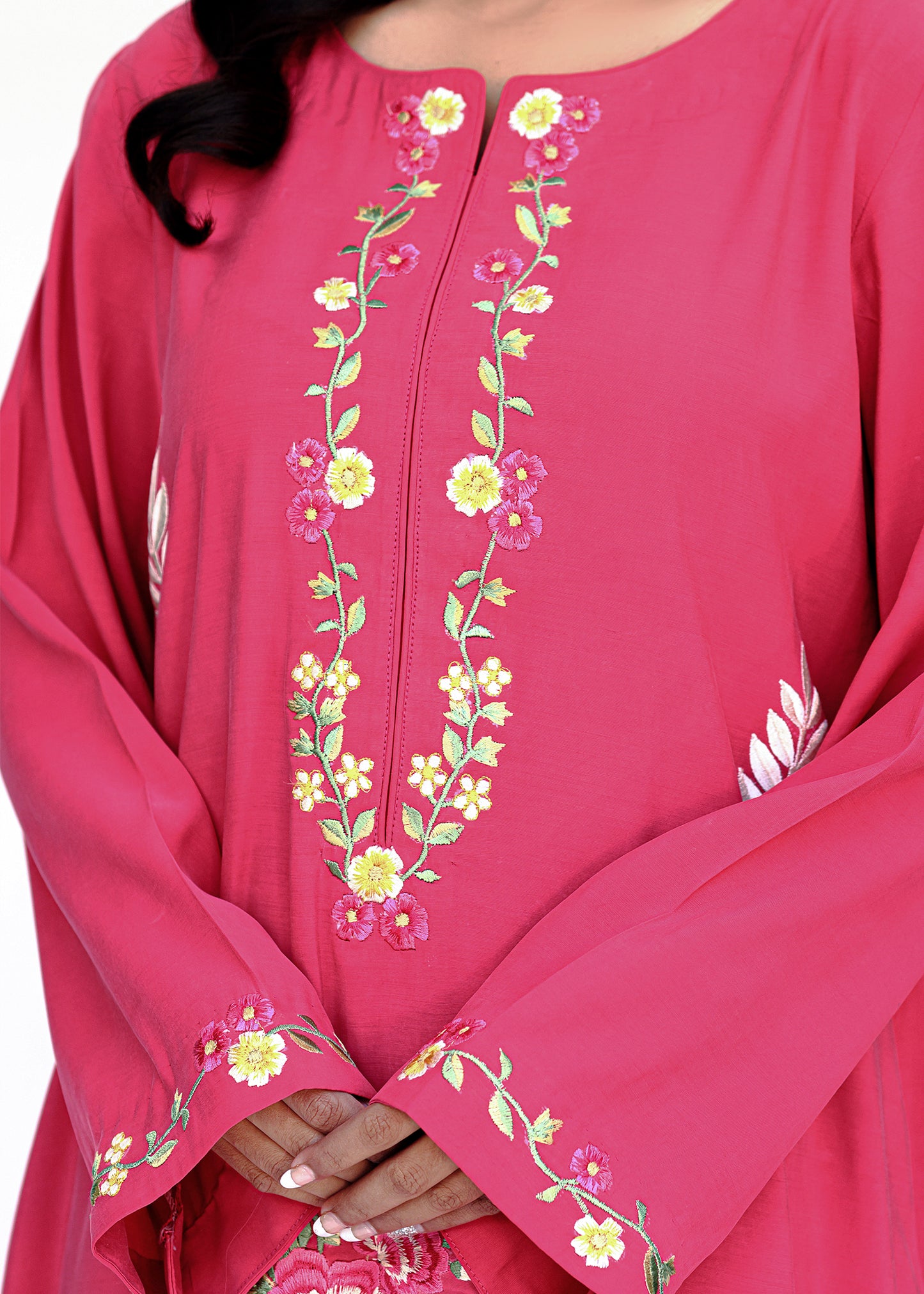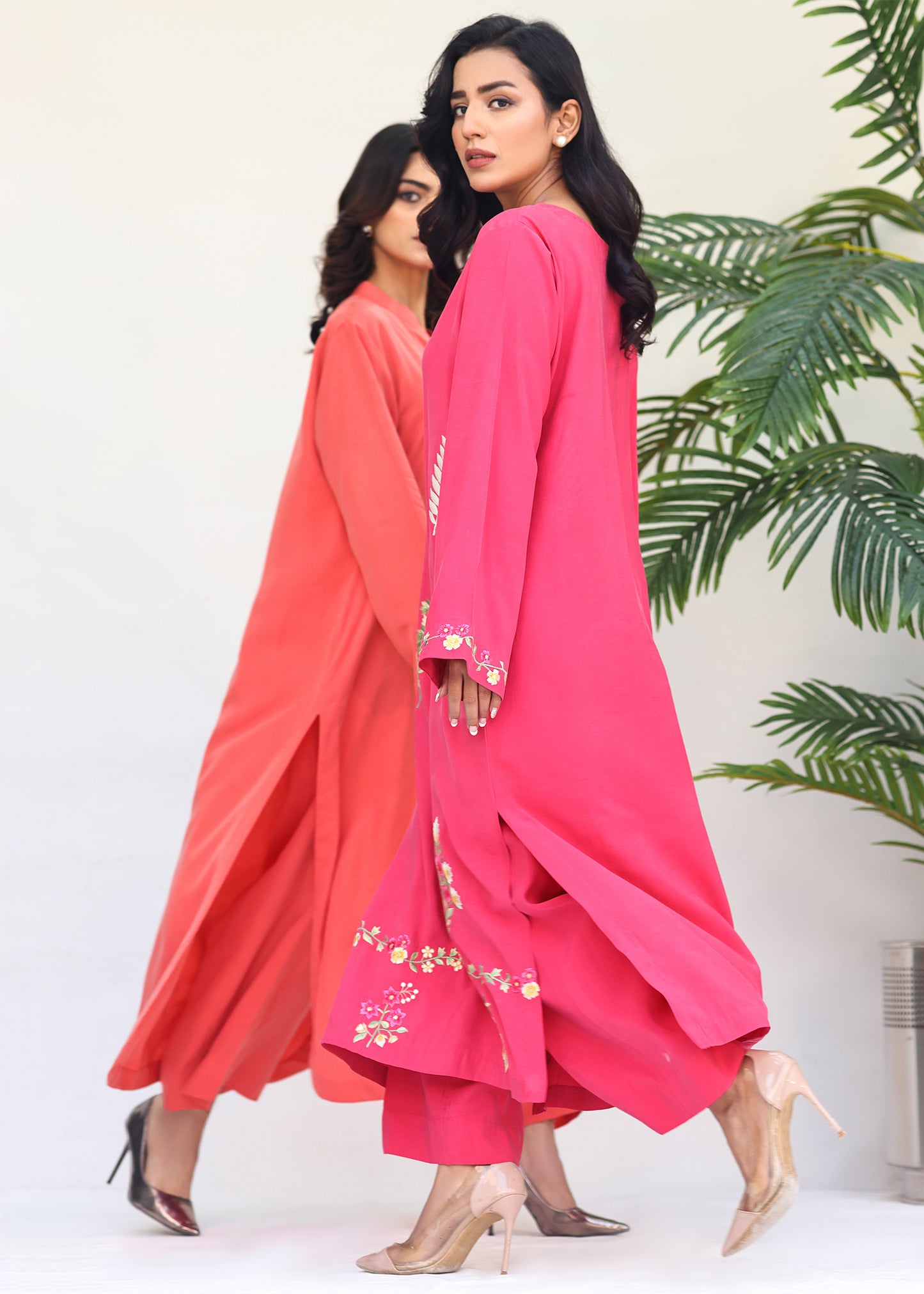 Delicately embellished pink stonewash shirt paired with matching culottes featuring intricate floral embroidery blending casual comfort with refined elegance.